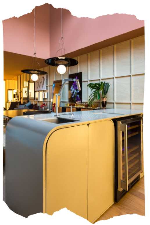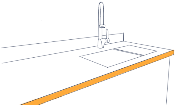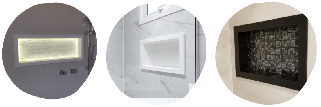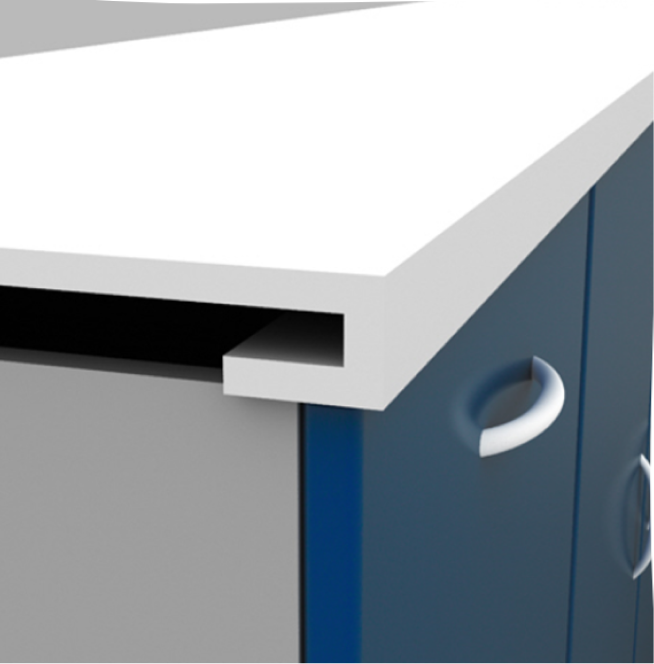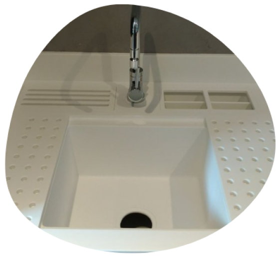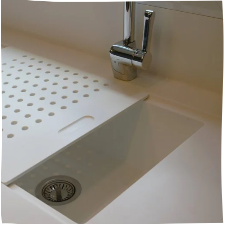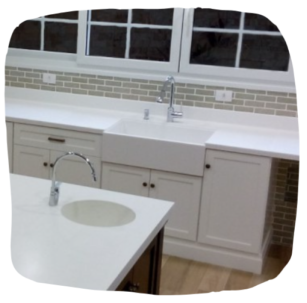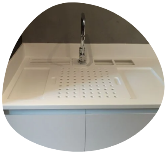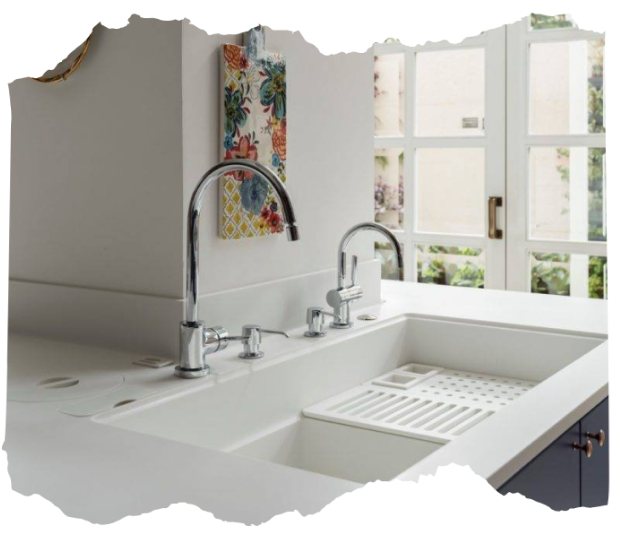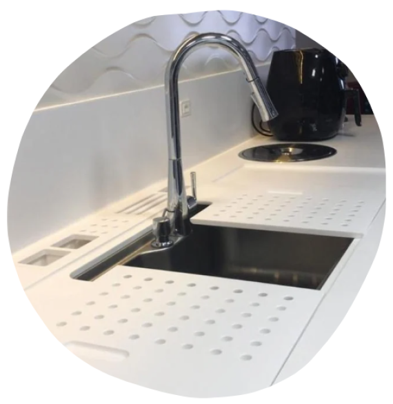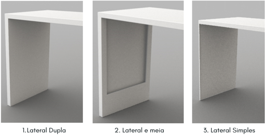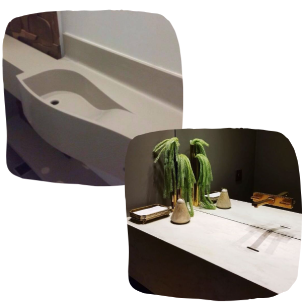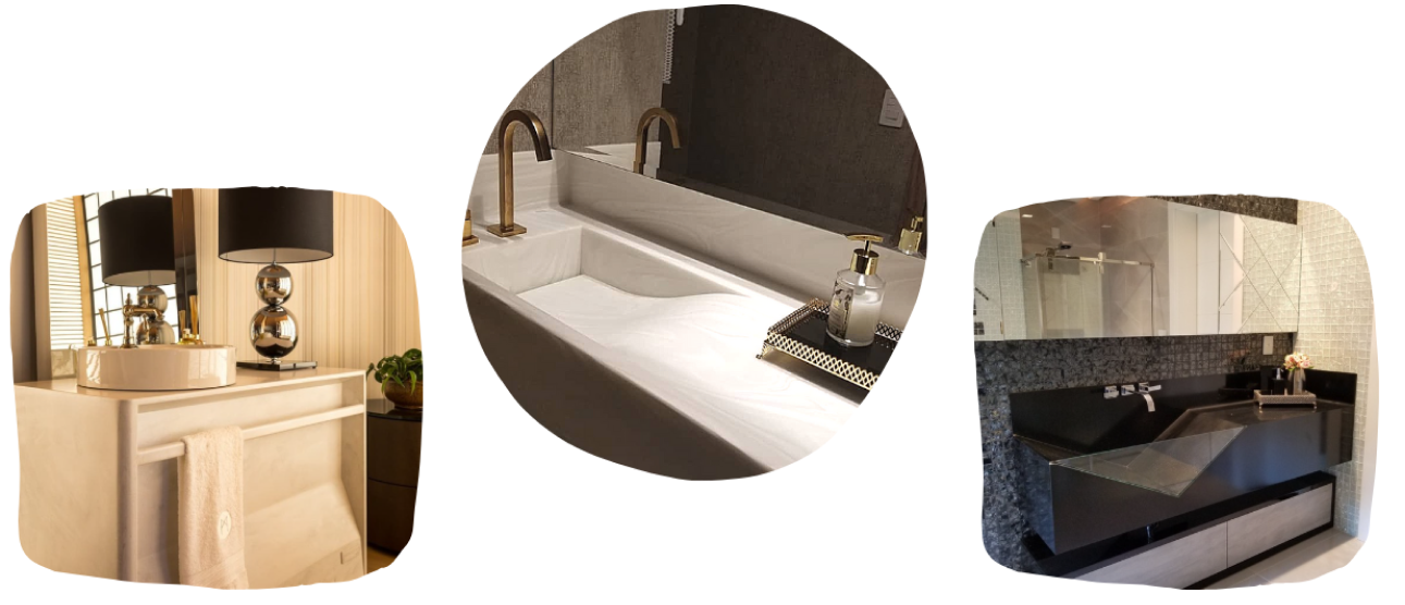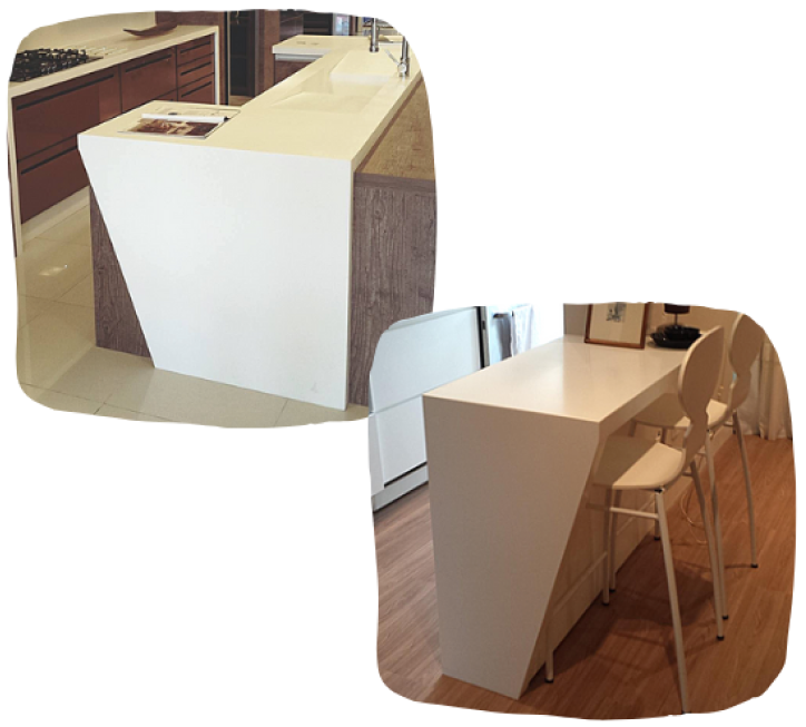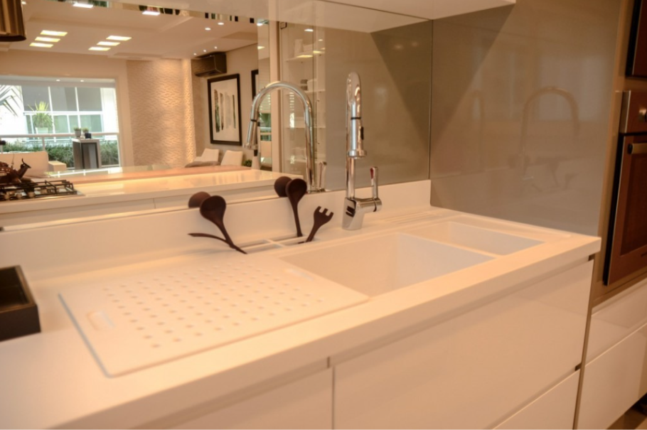 Bancada, cuba nichos e tampas em Corian Glacier White.